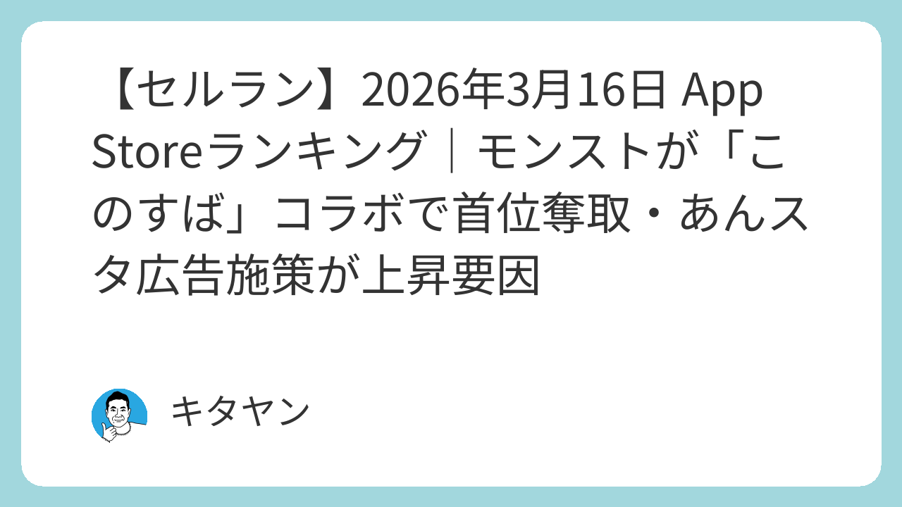 2026年3月16日のApp Storeセールスランキングでは、『モンスターストライク(モンスト)』がアニメ「この素晴らしい世界に祝福を!」コラボにより首位を獲得。前日まで首位を維持していた『プロ野球スピリッツA』は2位へ後退。また『あんさんぶるスターズ!!Music』ではキャラ誕生日キャンペーンや屋外広告が重なり3位へと順位を上げた。