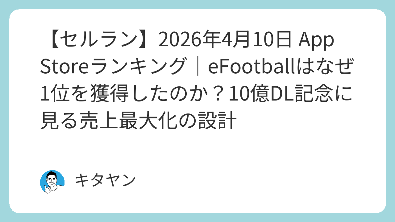 2026年4月10日のApp Storeセールスランキングでは、『eFootball™』が世界累計10億ダウンロード記念を起点とした大型施策により1位を獲得。アップデートやバランス調整、ガチャを同時展開することで、短期間で大きく順位を伸ばす結果となった。